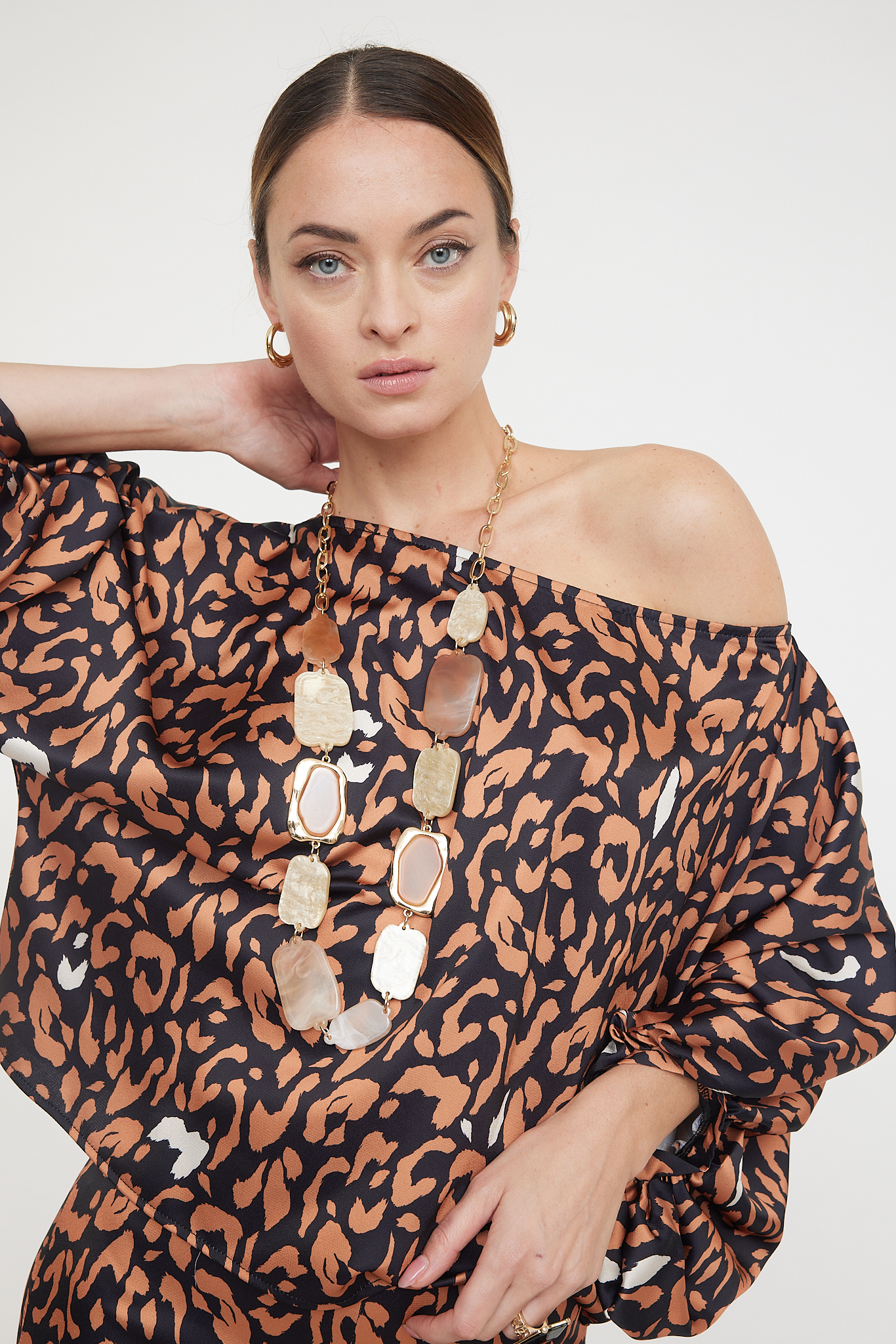 Le top Doly revisite l’imprimé léopard dans une version élégante et contemporaine. Confectionné dans une matière fluide et légère, il se distingue par sa coupe ample et son décolleté bateau qui peut se porter légèrement épaules nues pour une touche sensuelle et chic.