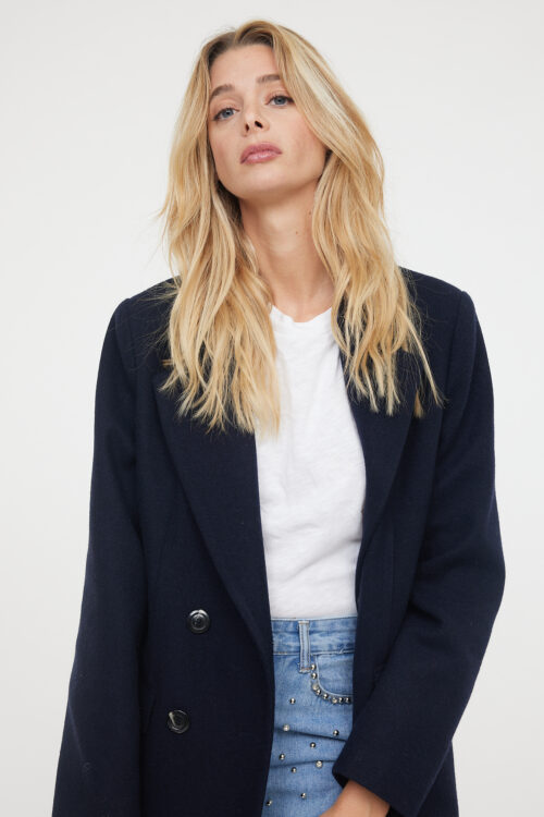 Le manteau Jaja incarne la sophistication effortless propre à Joey & Joey. Confectionné dans un drap de laine souple à motif chevron, il se distingue par sa coupe légèrement oversize, ses épaules droites et sa fermeture croisée à double boutonnage. Les poches à rabat et le revers cranté renforcent son allure tailoring, tandis que sa longueur mi-cuisse lui permet de s’adapter aussi bien à un look professionnel qu’à une silhouette casual chic.