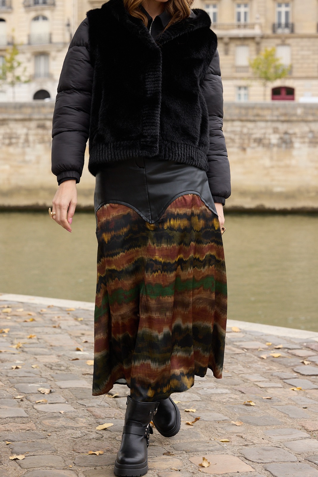 Son empiècement taille haute en simili cuir structure la silhouette et affine la ligne, tandis que le bas fluide révèle un imprimé tie & dye dans des nuances profondes : brun, vert, ocre et doré.