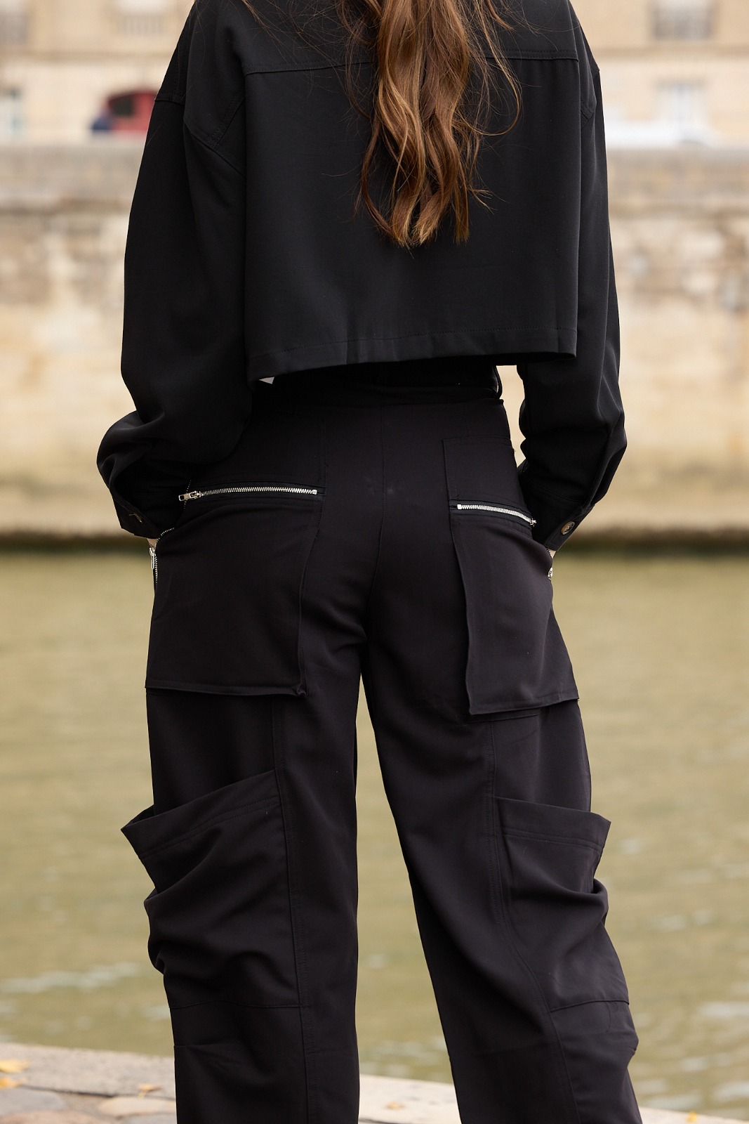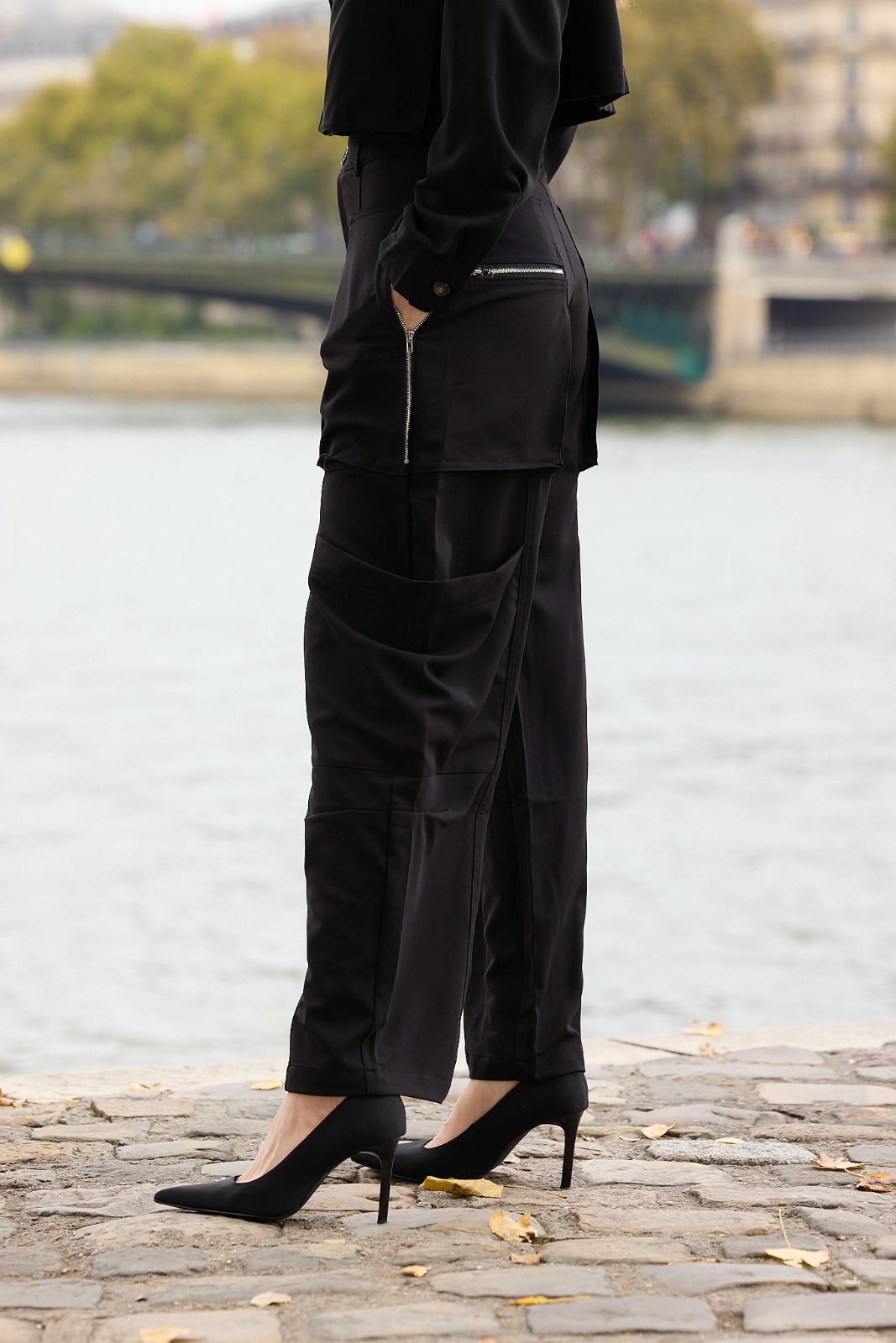 Sa coupe droite légèrement ample allonge la silhouette tandis que ses poches oversize et ses zips métalliques ajoutent une note graphique et urbaine. Confectionné dans une matière fluide et technique, il offre une allure à la fois chic et décontractée, idéale du bureau à la ville.