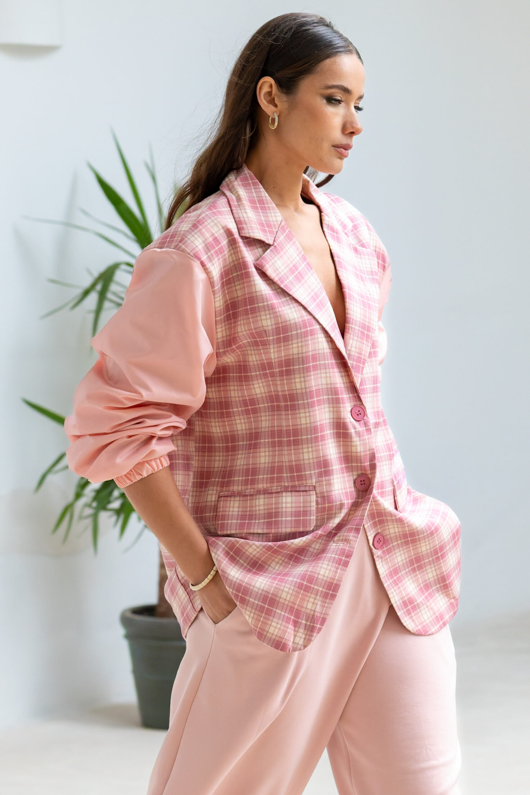 La veste Prady est une pièce élégante qui modernise le blazer classique avec subtilité. Son motif à carreaux roses, délicat et lumineux, contraste harmonieusement avec ses manches unies pour un effet structuré et original.