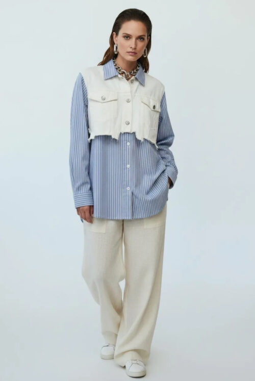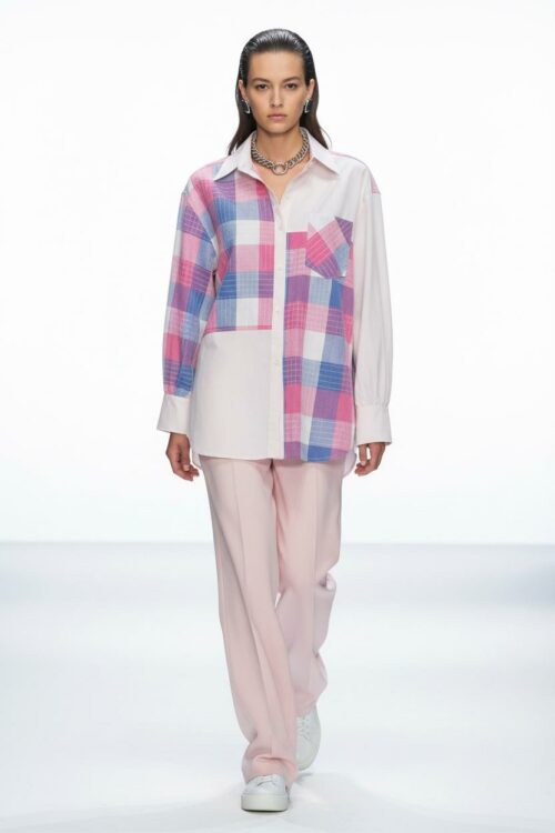 La chemise Talia se distingue par son patchwork de carreaux aux tons rosés et bleutés, subtilement équilibré par des empiècements unis. Sa coupe fluide et légèrement oversize apporte un tombé naturel et confortable, tandis que le col classique et la poche poitrine structurent la silhouette. Facile à porter au quotidien, Talia se marie aussi bien avec un pantalon tailleur qu’avec un denim pour un style chic décontracté. Une pièce forte, douce et contemporaine.